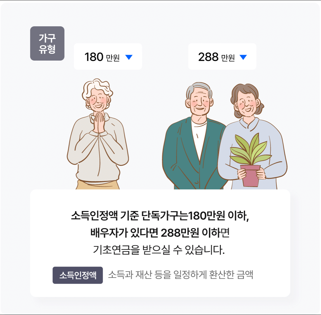 기초연금지급액을 지급할지 여부는 신청하는 분의 월소득인정액 기존의 수급자격이 결정되므로 기초연금소득인정액의 계산이 매우 중요합니다.