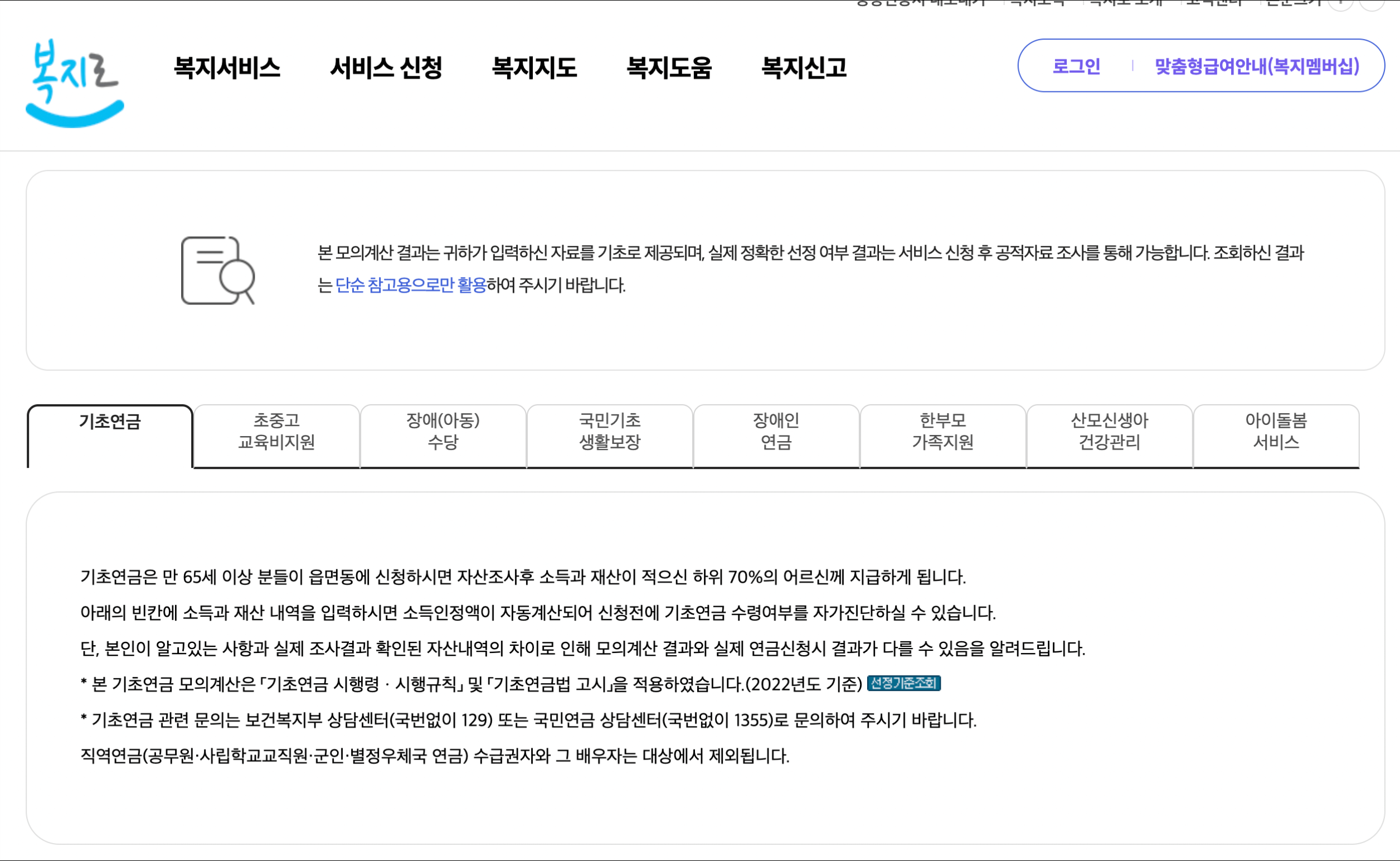 기초연금(기초노령연금)의 모의계산은 회원등록이 필요하신 국민연금포털에서도 제공합니다만, 비회원이라도 가능한 복지로 포털을 사용한다면 회원등록 없이 바로 사용이 가능합니다.
