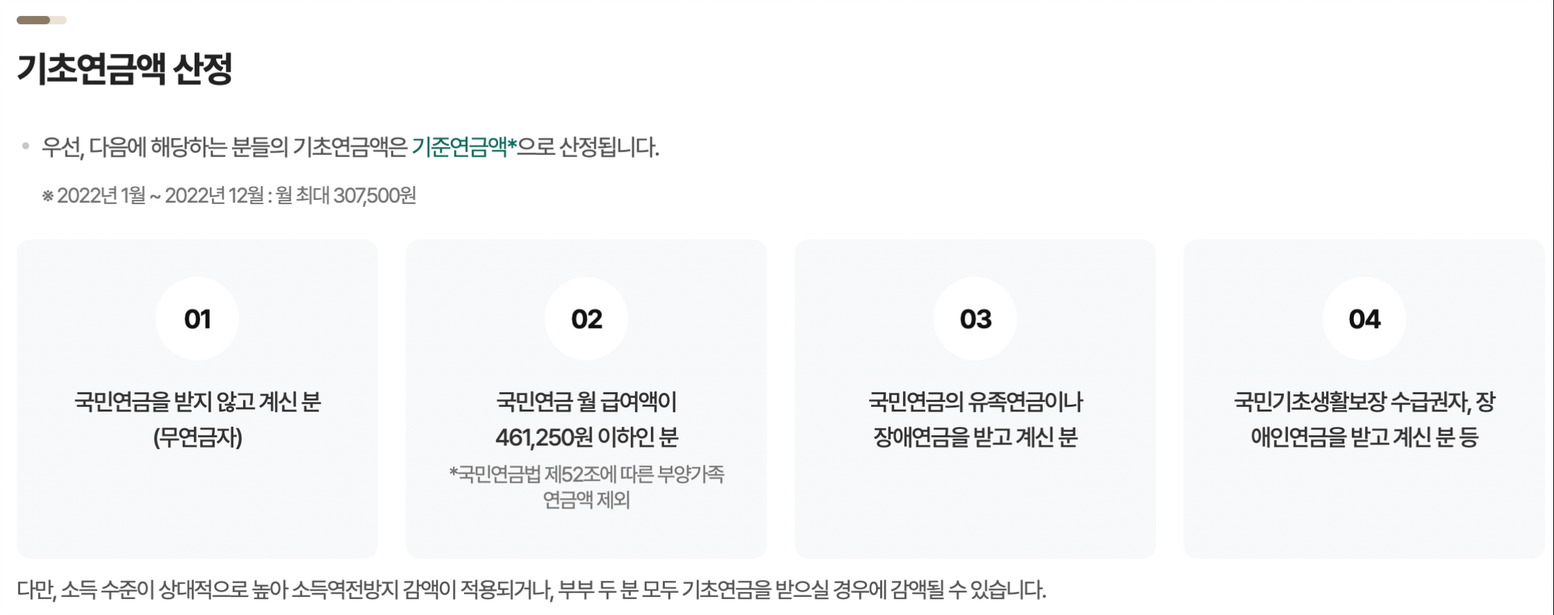 기초연금(기초노령연금) 지급액은 상기의 산식으로 계산된 지급액이 기초연금기준연금액을 넘어도 최고액인 기초연금지급액이 산정됩니다. 다만, 소득 수준이 일반 국민보다 높게 소득 역전 방지 감액이거나 부부 두부도 기초 연금(기초 노령 연금)을 받는 경우 감액될 수 있습니다.
