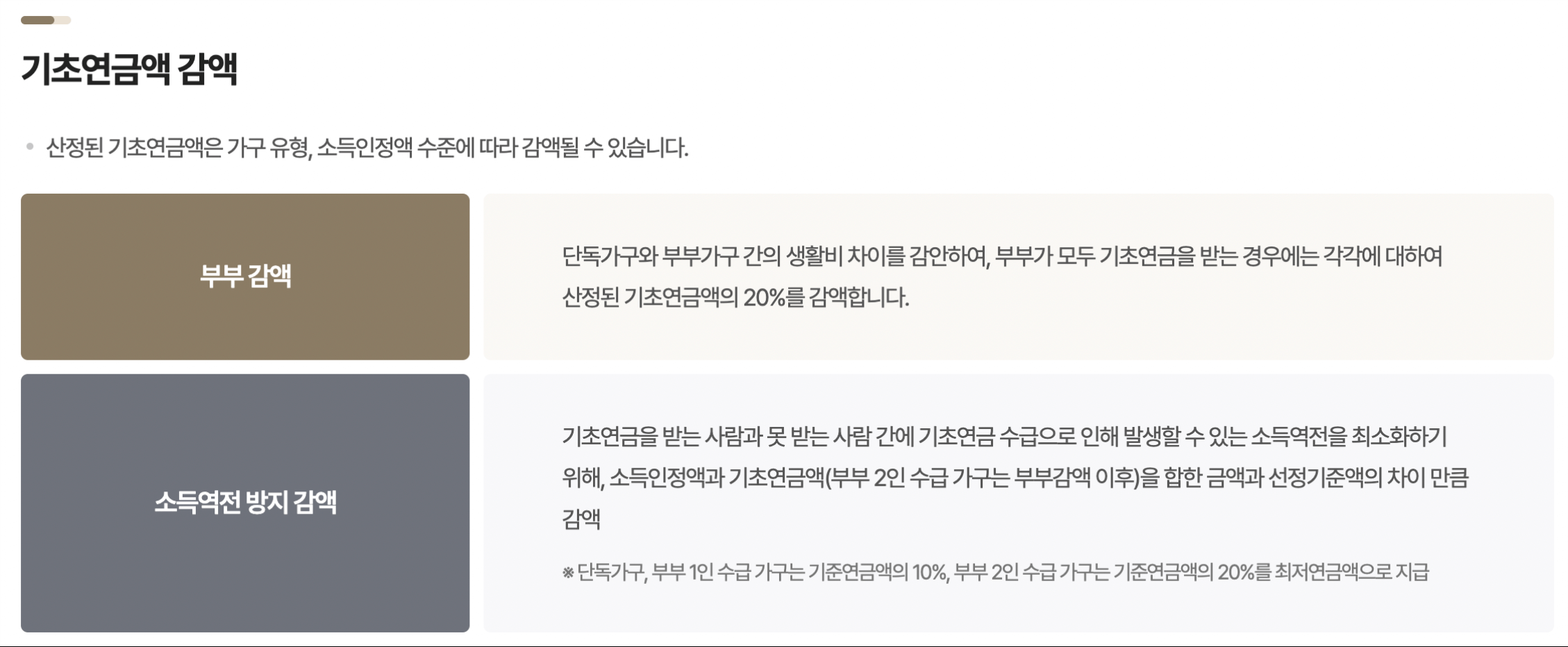 - 부부공제방식은 본인과 배우자 전부 가 기초연금을 받는 경우에 사용됩니다. 부부의 감액방식에 따라 기준연금지급액을 통해 각각 20%씩 감액됩니다.