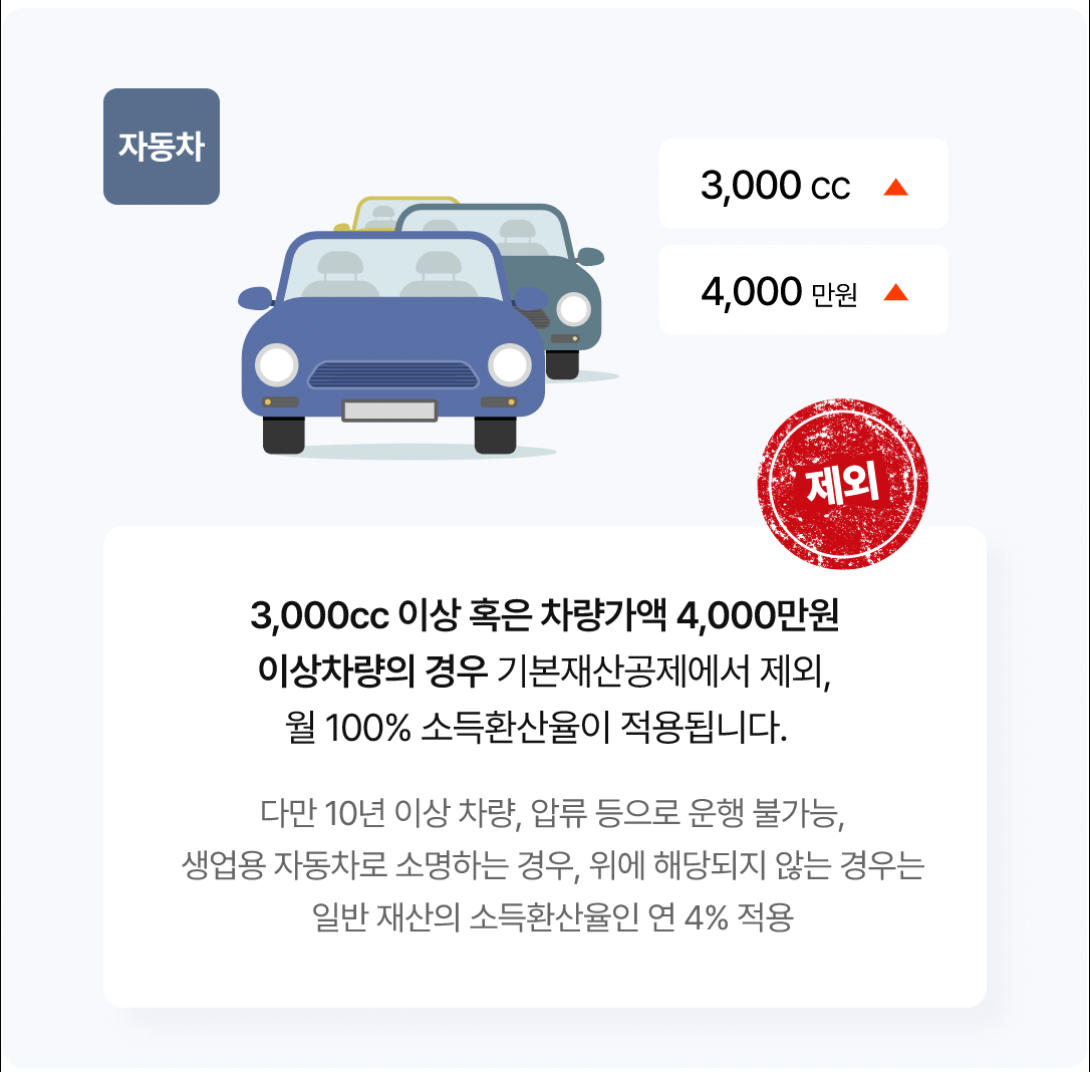 자동차를 기준으로 하고 있습니다만, 부동산은 제외 2대 이상 보유하고 있는 경우, 기초 연금 신청자가 선택한 1대만의 재산 범위로부터 제외할 수 있습니다. 이 경우 기초연금신청인이 선택하지 않은 나머지 차량의 재산가액을 소득환산금액으로 합니다.