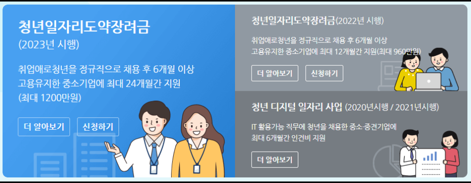 5명 이상 우선 지원 대상 기업을 우선적으로 취업가능 청년을 정식 직원으로 채용한뒤, 6개월 이상으로 고용을 하고 있는 상태가 유지될 경우 최대 2년간 최대 1,200만원을 지원합니다.